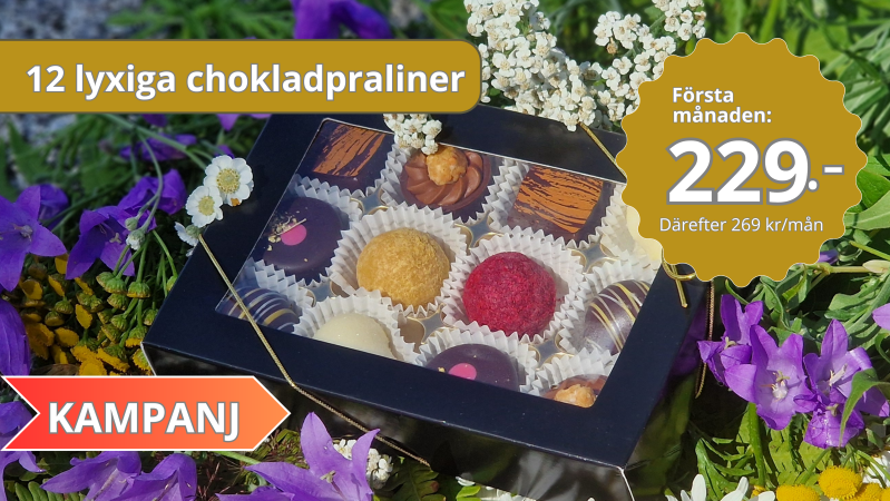 Varje månad får du hem ett paket som förgyller din dag, laddat med exklusiva svensktillverkade chokladpraliner. Unna dig själv eller ge bort som present. Kanske större asken passar ditt företag - belöna ditt team? Beställ och betala med Klarna Faktura